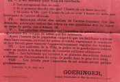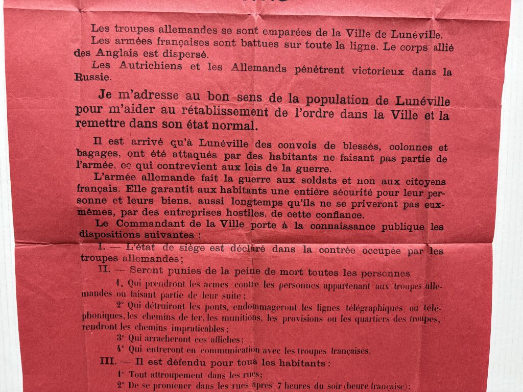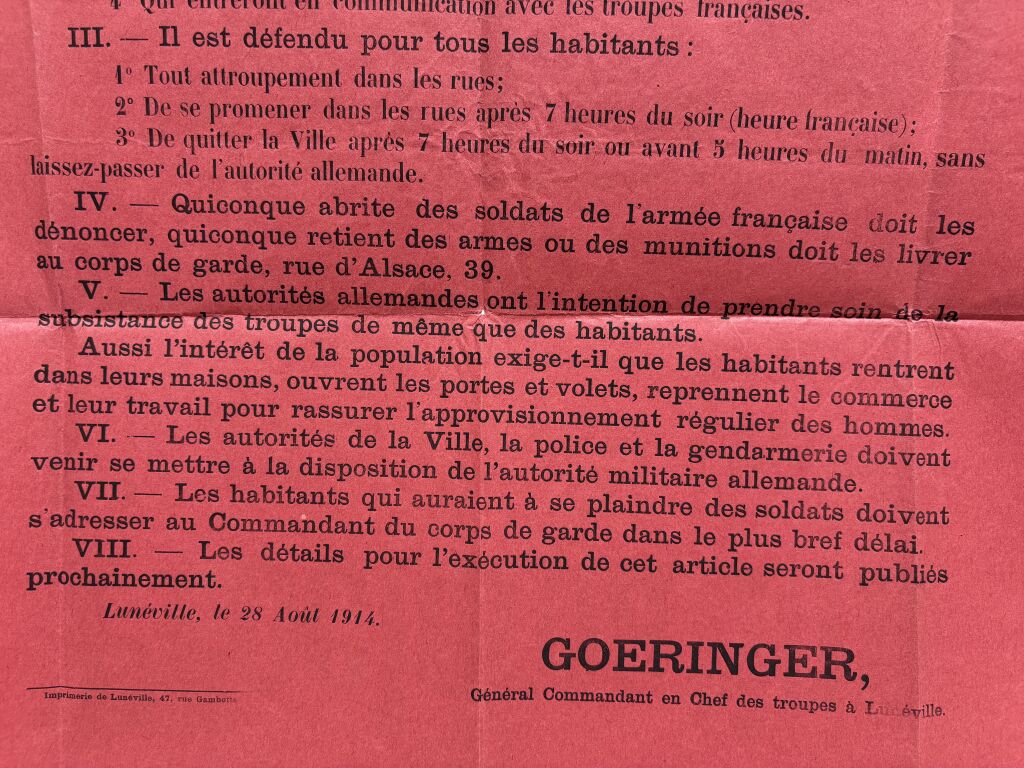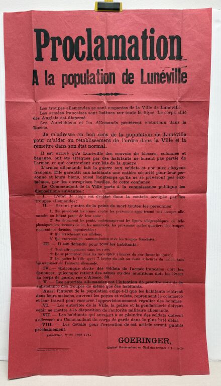 Rétablissement de l'ordre - l'état de siège est déclaré - peine de mort : quiconque abrite des soldats de l'armée française doit les dénoncer ....couvre feu, peine de mort pour ceux qui arracheront cette affiche .... Signé GOERINGER Général commandant en chef des troupes à Lunéville - 85 x 47,5 cm - Imp. de Lunéville, 47 rue Gambetta.