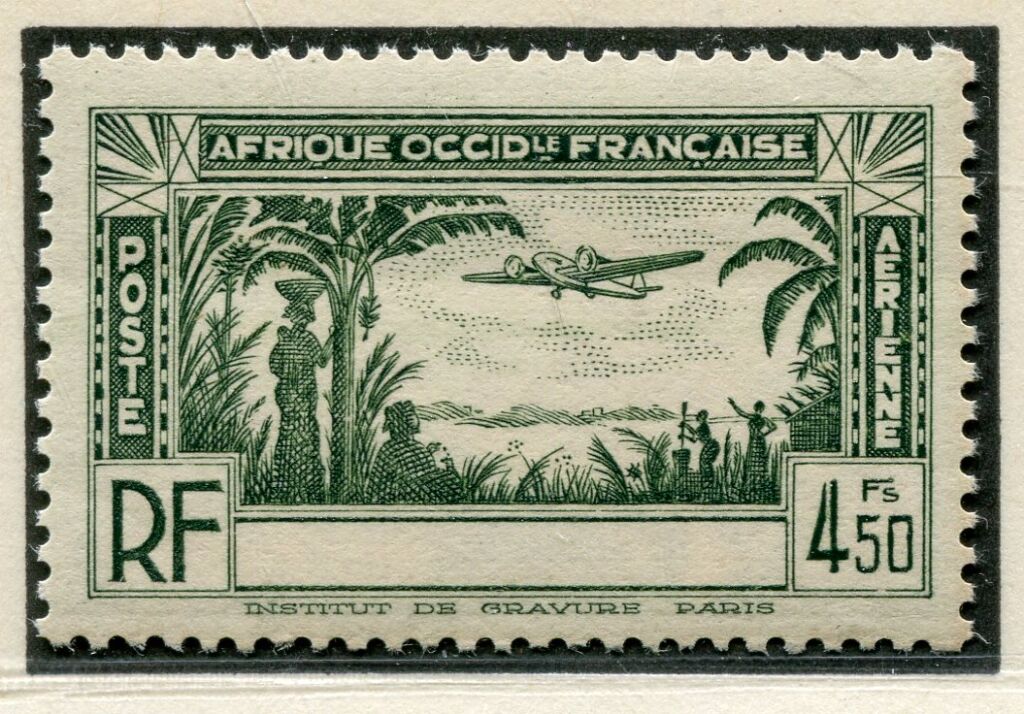 AFRIQUE OCCIDENTALE FRANCAISE 1940 : cote d'voire + guinée + Sénégal + soudan + Dahomey + haute volta + Mauritanie + Niger. RARE VARIETE SANS le NOM du PAYS du timbre à 4 F 50 olive "avion au dessus d'une palmeraie" (classé par Yvert à Cote d'Ivoire avion n° 3 a) - neuf **