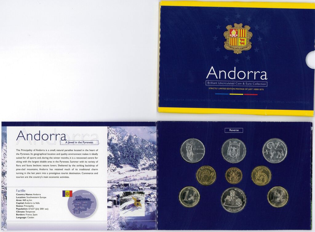 ANDORRE - Coffret fleur de coin 2002 - Comprend les 7 pièces "PRINCIPAT D'ANDORRA" de 1 centime à 10 centimes (Isard / Charlemagne / Agnus Dei / Ecureuil / Grouse / Fleur) + 1 euro de France et 1 euro d'Espagne.
