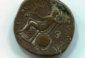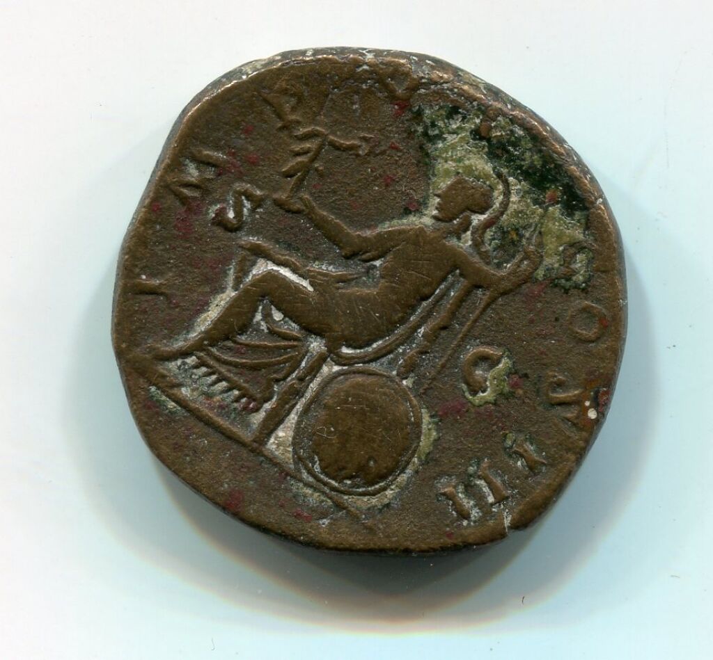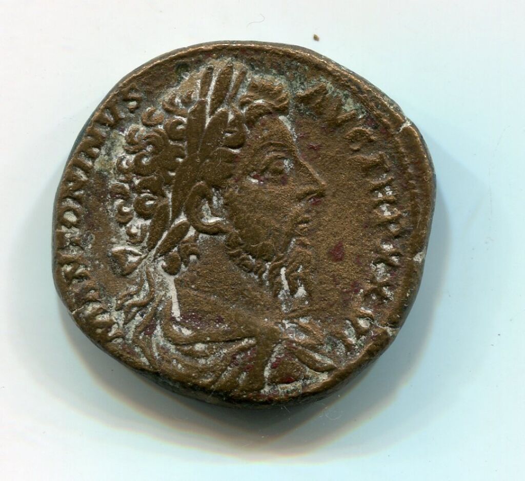 Tête de Marcus Aurelius laurée, profil à droite, légende M ANTONINVS AUG TR P XXVI (Marc Aurèle antoninus empereur, détenteur de la puissance tribunienne pour la 26e fois). - Revers : IMP COS III SC (commandant suprême pour la 6e fois, consul pour la 3e fois, décret du Sénat), Rome casquée, drapée, assise. Profil à gauche tenant la Victoire de la main droite tendue et une lance de la main gauche -