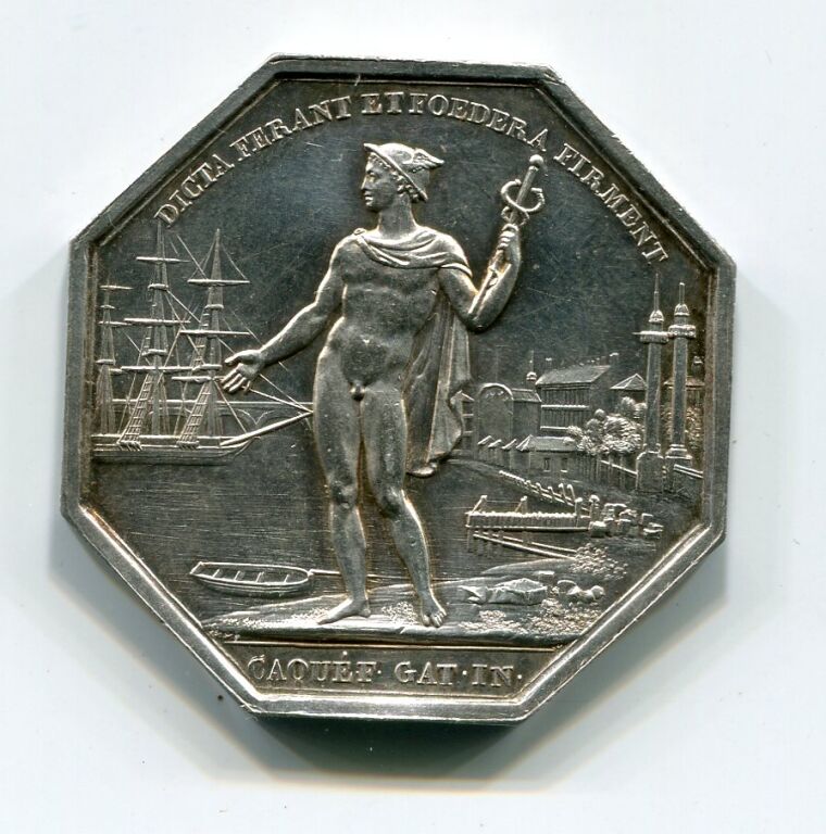 Revers : Mercure nu, debout, tenant le caducée ; devant le port et ses bateaux, gravure de F. Caqué - Tranche : poinçon main indicatrice et mention argent - 13,06 gram. - SUP