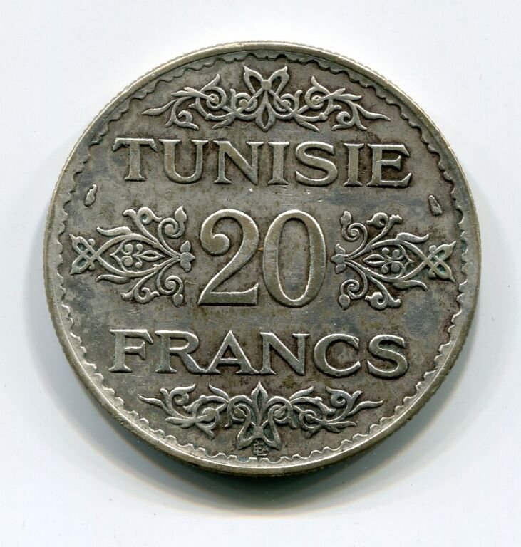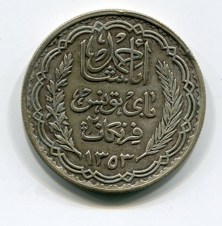 ARGENT - TUNISIE - VINGT FRANCS 1934 du Bed Ahmed, gravure de Lindauer.