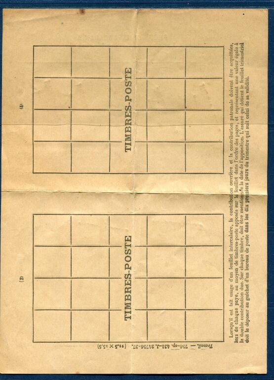 PAR EXCEPTION certains travailleurs à façon ou intermittents, en particulier dans l'agriculture, restèrent assujettis au paiement par timbres. Les timbres spéciaux n'existant plus il fut employé des timbres poste normaux apposés sur des feuilles spéciales. Ce système dura normalement de 1935 à 1945.
