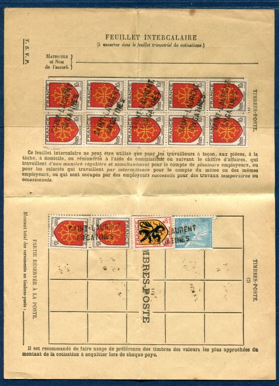 - feuillet intercalaire d'assurance maladie de l'année 1944 (utilisation tardive intéressante) - Comporte 14 timbres : 12 timbres blason Languedoc (603) + blason des Flandres (602) + 1 F bleu Iris (650). Annulation des timbres par griffe linéaire 2 lignes du bureau de poste de " SAINT LAURENT / EN GATINES ".