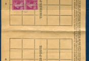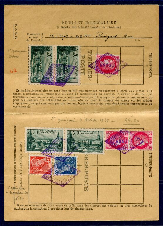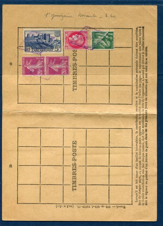 PAR EXCEPTION certains travailleurs à façon ou intermittents, en particulier dans l'agriculture, restèrent assujettis au paiement par timbres. Les timbres spéciaux n'existant plus il fut employé des timbres poste normaux apposés sur des feuilles spéciales. Ce système dura normalement de 1935 à 1945.