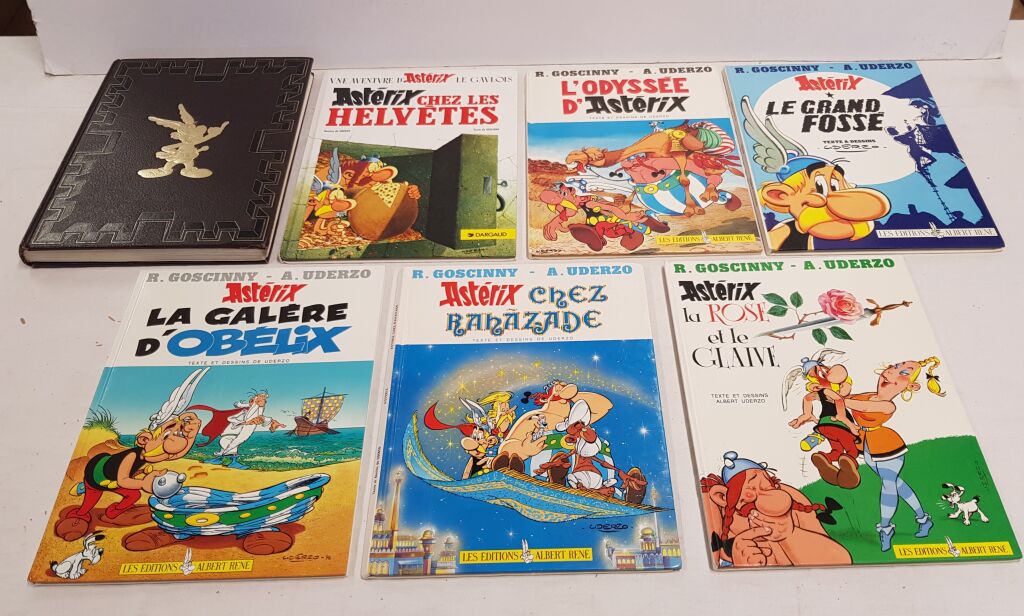 - " la galère d' Obélix " Albert René éditions 1996 + " Astérix chez Rahazade " Albert René 1987 + " Astérix la rose et le glaive " Albert René 1991 + Astérix " le Grand fossé " Albert René 1980 + " l' odyssée d' Astérix " Albert René 1981 + " Astérix chez les Helvètes " Dargaud ed 1970.