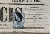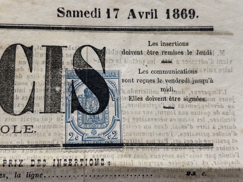 AUBE (10) - TIMBRES JOURNAUX sur JOURNAL ENTIER : timbre journal n° 8 "blason impérial ", 2c bleu dentelé, timbre oblitéré par la typographie (l'imprimeur collait le timbre sur sa feuille de papier vierge et l'impression du texte annulait le timbre).