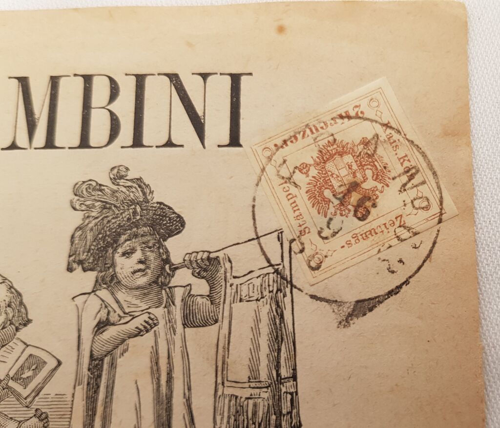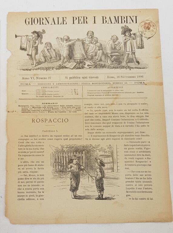 AUTRICHE TIMBRE POUR JOURNAUX n° 3 ( * ) , 2 kreutzer marron armes impériales posées sur un aigle bicéphale - SUR JOURNAL ENTIER (1ère page illustrée de chérubins musiciens ) " Giornale per i bambini " (journal des enfants), édité à Rome, numéro 37 du 16 septembre 1886. - Le timbre collé directement sur le journal en haut à droite est oblitéré, cachet à date rond, " F.P.A. n° 63 16 9 86.