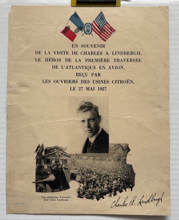 26 x 20 cm - en haut drapeaux croisés des États Unies et de la France sur emblème au chevron ; en centre photo de l'aviateur, en bas photo de la foule venu écouter son discours dans la cour de l'usine Citroën. (petits défauts en pourtour blanc).