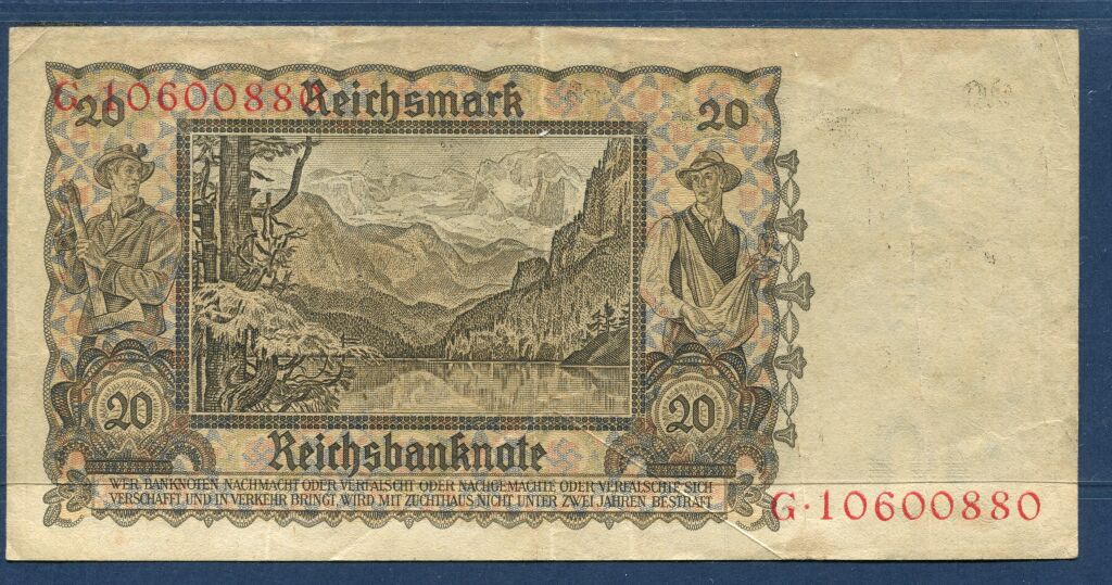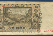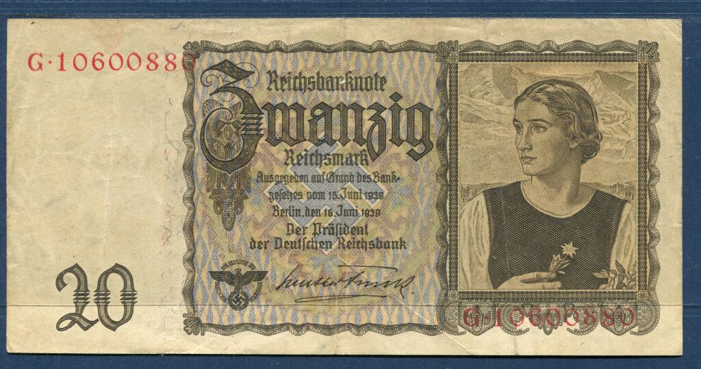 BILLETS ALLEMAGNE 3e REICH - 20 REICHMARK, émission de Berlin du 16 juin 1939. Portrait de jeune femme, en tenue traditionnelle, tenant un edelweiss - au verso : lac & paysage de montagne encadré d'un bucheron & paysan semeur - TTB