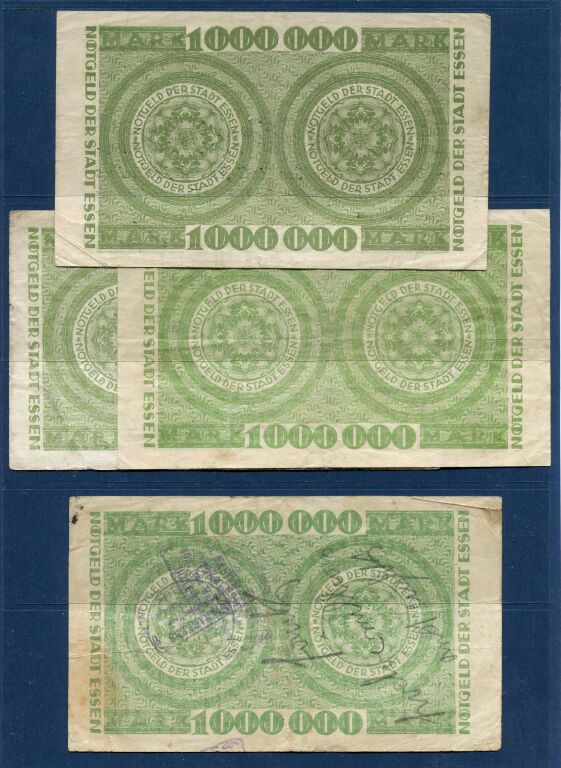 BILLETS ALLEMAGNE INFLATION - QUATRE BILLETS de la ville d' ESSEN, 4 billets de UN MILLION de MARK, émissions du 12 août 1923, numéros de séries différentes. TTB