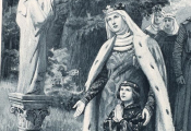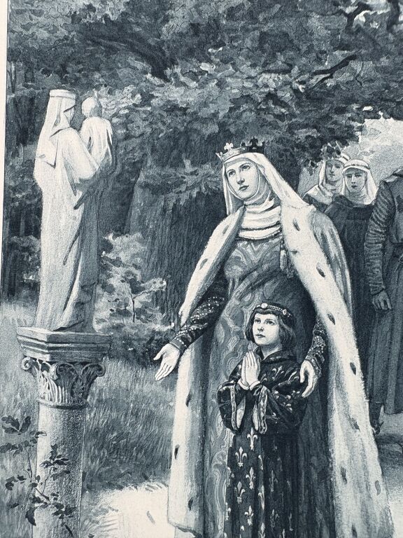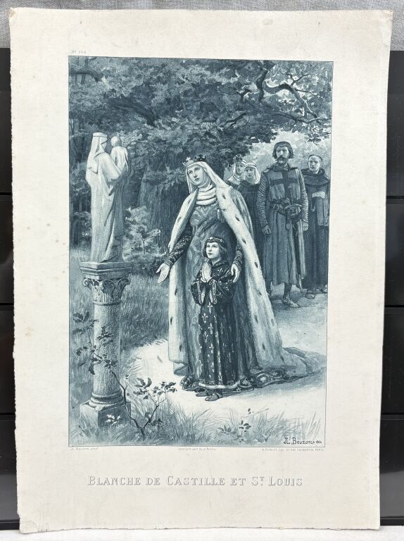 BLANCHE de CASTILLE et LE ROI SAINT LOUIS - Grande lithographie signé JL BEUZON ( * ) et datée 1904 - Le petit Roi et sa mère régente prient devant la statue de la Vierge - Signée A. ROBLOT pour l'impression, en bleu acier., grande épreuve sur vélin 31,5 x 22,5 cm - ( format image 23,5 x 16 cm).