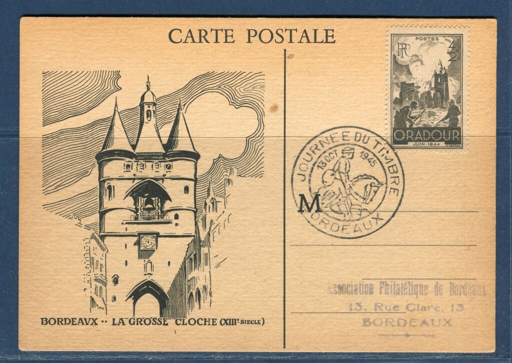 BORDEAUX - JOURNEE du TIMBRE 1945 - carte postale commémorative "premier jour" de l'Association Philatélique de Bordeaux - illustration "la grosse cloche " avec timbre Oradour sur Glane n° 742 oblitéré du grand cachet illustré d'un messager à cheval " Journée du Timbre - Bordeaux - 13 octobre 1945 ".