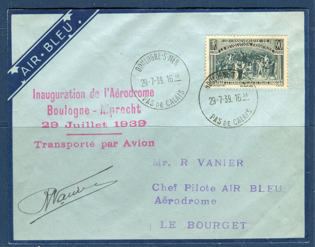 BOULOGNE SUR MER (62) - INAUGURATION de L' AERODROME D' ALPRECHT le 29 juillet 1939 - Lettre AIR BLEU, enveloppe officielle papier bleu avec décors et logo de la Compagnie pour Raymond VANNIER, chef pilote Air Bleu aérodrome du BOURGET ( * ).