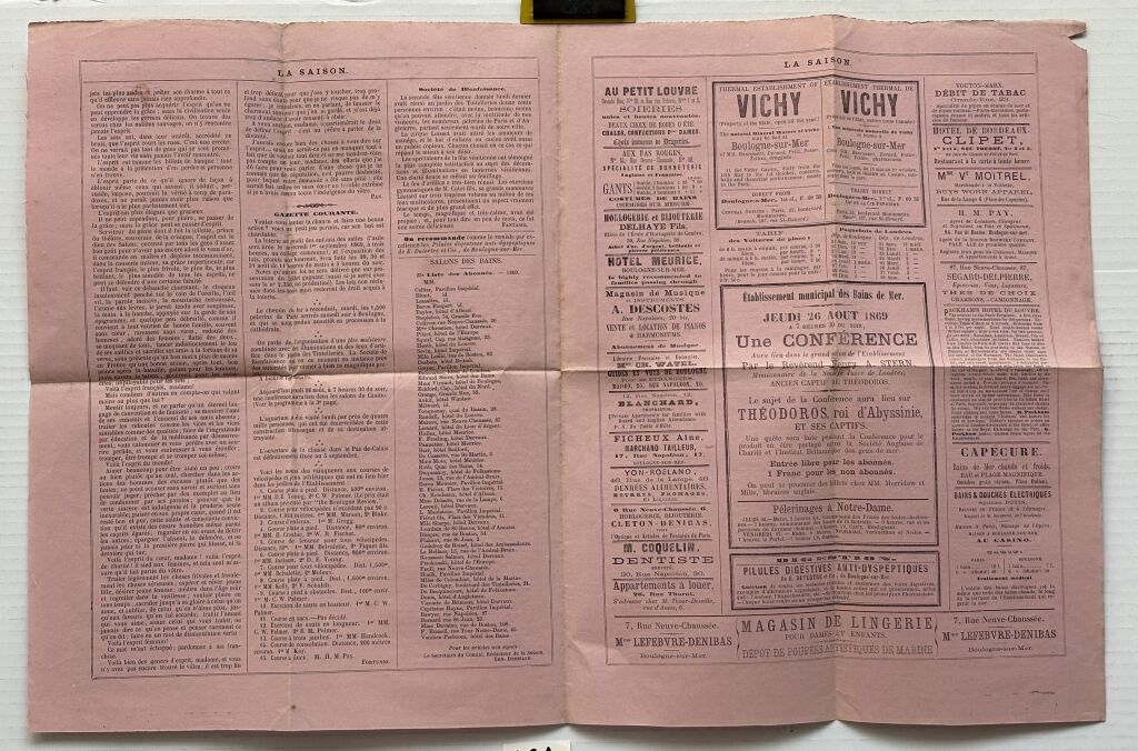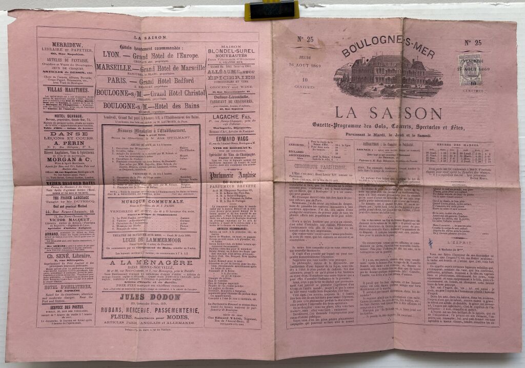 sur journal " LA SAISON gazette programme des bals, concerts, spectacles et fêtes " - Programmes, gazette locale courante, publicités des commerces locaux et nationaux, hôtels etc.. - numéro 25 du vendredi 27 août 1869.