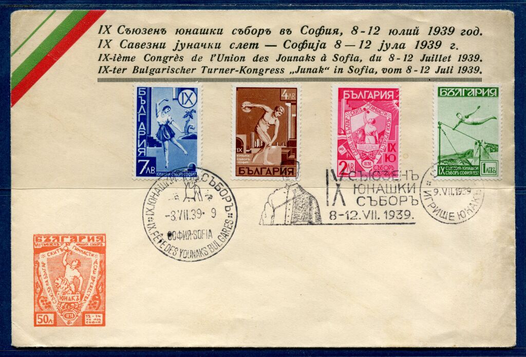 BULGARIE ( ROYAUME de…) 8 juillet 1939 - enveloppe officielle illustrée commémorative du Congrès et concours de l' union des Sociétés de Gymnastique " Jounnaks " à Sofia du 8 au 12 juillet 1939 - Enveloppe revêtue des 4 timbres n° 335 à 338 oblitérés du grand cachet spécial de l'évènement et flamme illustrée à l'image du fondateur du mouvement.