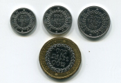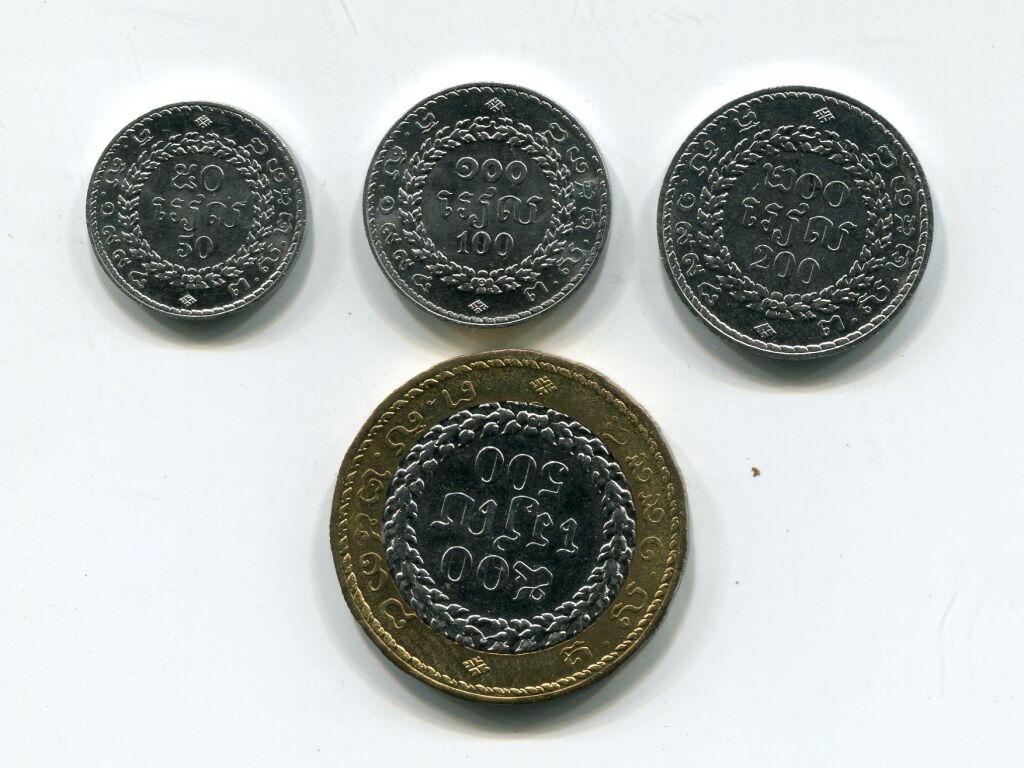 CAMBODGE 1994 - Collection de quatre monnaies de 50 riels à 500 riels - 3 aluminium (50 + 100 + 200 riels) + 500 riels bimétallique. Emblèmes royaux et lieux de culte.