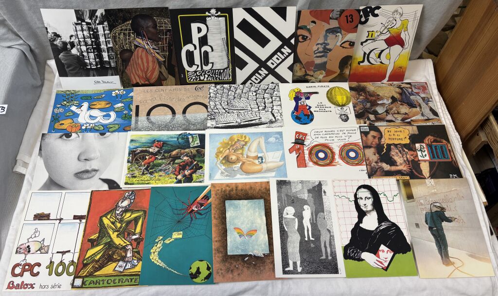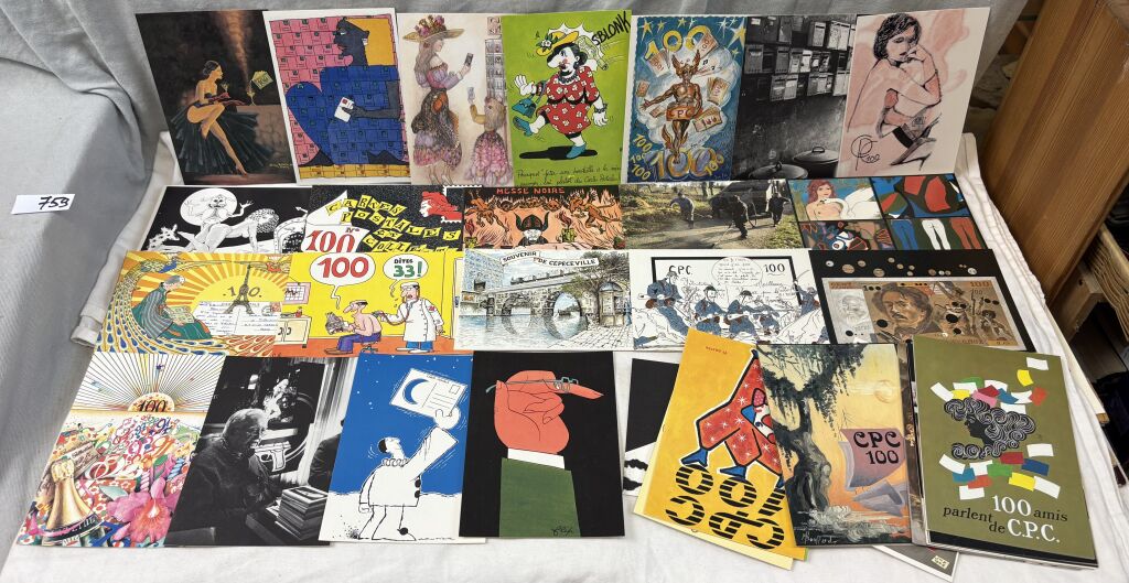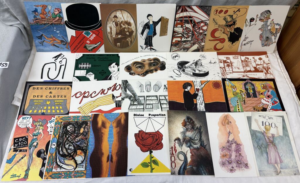 CARTES POSTALES MODERNES COMMEMORATIVES - LES 100 AMIS de C.P.C. " collection des cent ", créée par le mensuel C.P.C. " cartes postales collection " pour fêter son 100e numéro en janvier 1985 - Cent cartes postales différentes, chacune réalisée par un illustrateur ou photographe différents. Pour rendre hommage " à l'ancien " la numéro 1 est attribuée au photographe Albert Monier " les tourniquets dans Paris " ; cette carte, la seule, n'est pas imprimée mais tirée sur bromure photo. - La série à tirage limitée est numérotée sur cette carte n° 1 - Figure dans cette série une 101e carte " carte pirate" réalisée par Wilfried Biemans-Landais, inventeur de ce style d'émission.