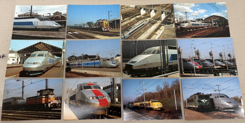 Photographe Jean WILLEMIN (Prix Kiwi 1991 pour cette collection) - DOUZE (12) cartes ) - postales : Marche d'essais à Aulnoye (59) - TGV A en gare de Raismes (59) - en mai 1990, gare Montparnasse TGV A et BB 22200 - août 1990 départ gare Bordeaux - essais en gare de Paul rame 537 - gare de Dreux rame 325, essais de mise au point - Châtillon 18 mai 1990 la rame 325 2 heures après le record du monde - 4 TGV A à Châtillon novembre 1989 - Châtillon Y 8122 conduit TGV A à l'atelier - essais de visibilité rame 317 - passage TGV postal et rame TGV A n° 366 - gare de Dreux TGV A, premières marches de réception.