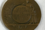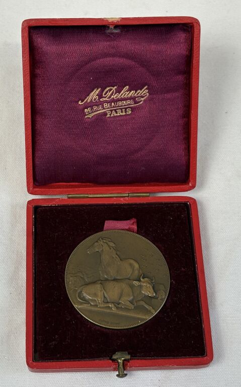 CIVRAY (86) - médaille de la SOCIETE D'AGRICULTURE de L'ARRONDISSEMENT… OEuvres du sculpteur Alphée Dubois suivant les dessins de Luc Oliver Merson. Avers : au 1er plan haut relief d'une vache couchée et cheval debout ; au fond moutons, oiseaux dans le ciel - Revers : titulature, gerbe d'épis de blé, paysanne, grappes de raisin.