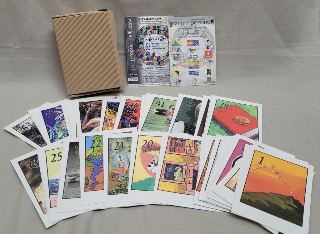 Collection commémorative de 65 cartes postales à tirage limité à 500 exemplaires - cartes postales d'auteurs" - 2 cartes de présentation + 63 cartes différentes spécialement créées par 63 artistes pour la circonstance - en leur coffret d'origine