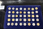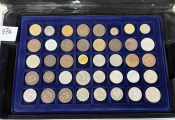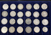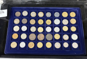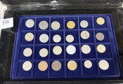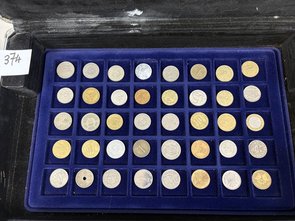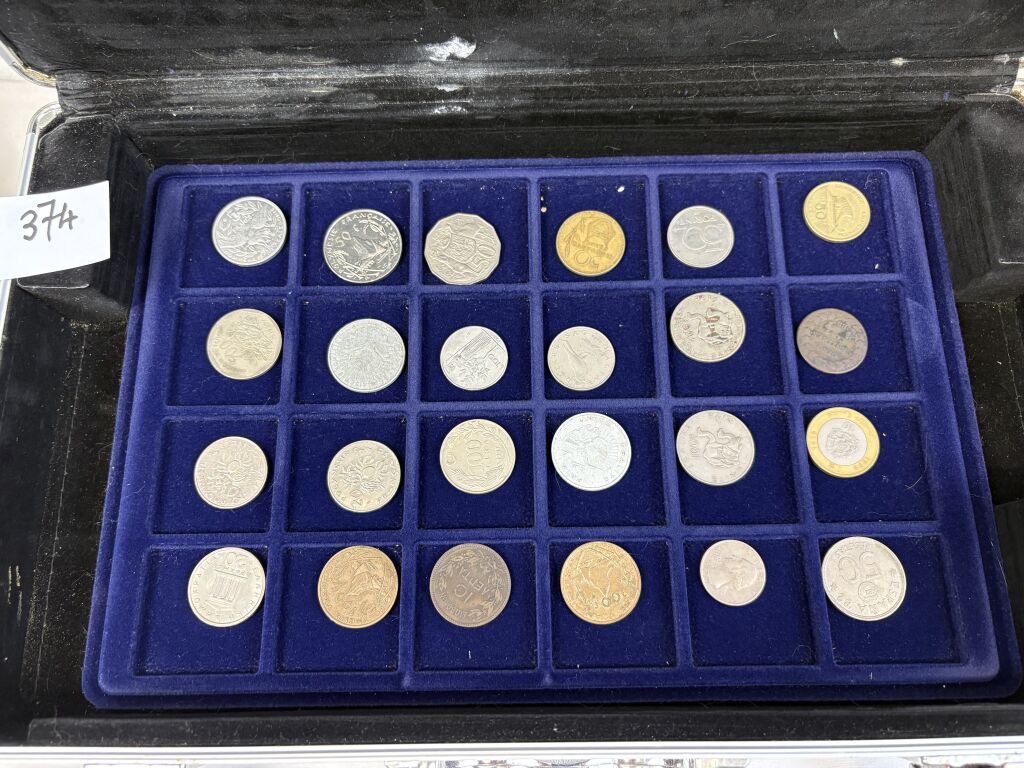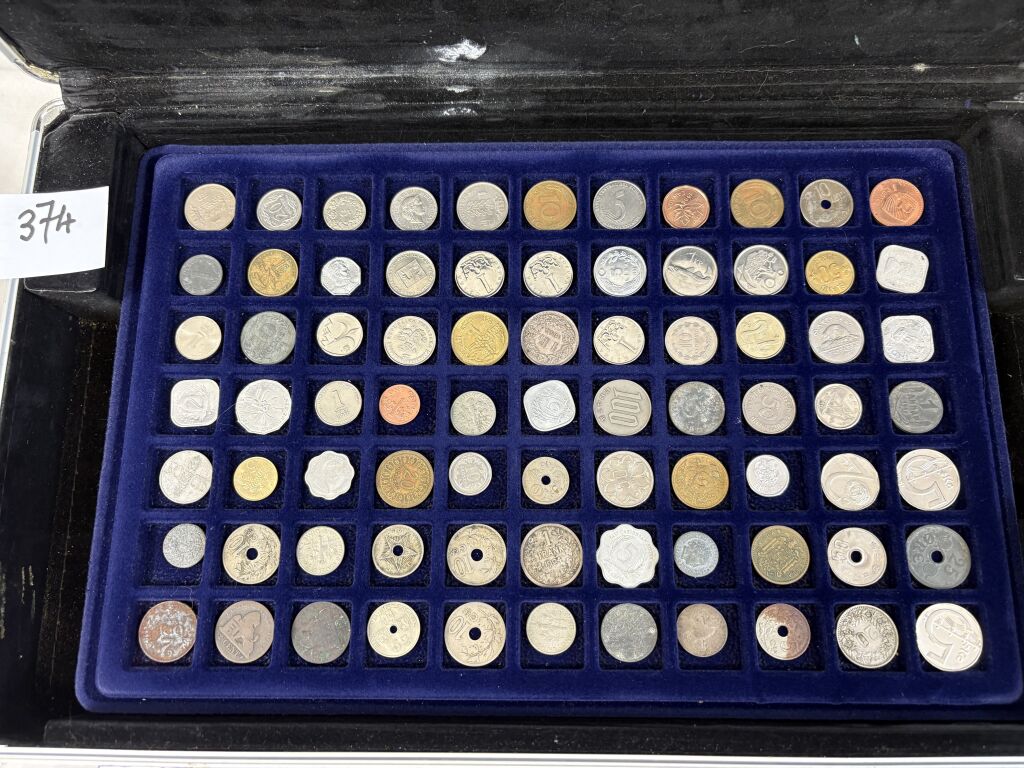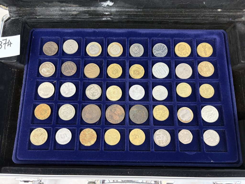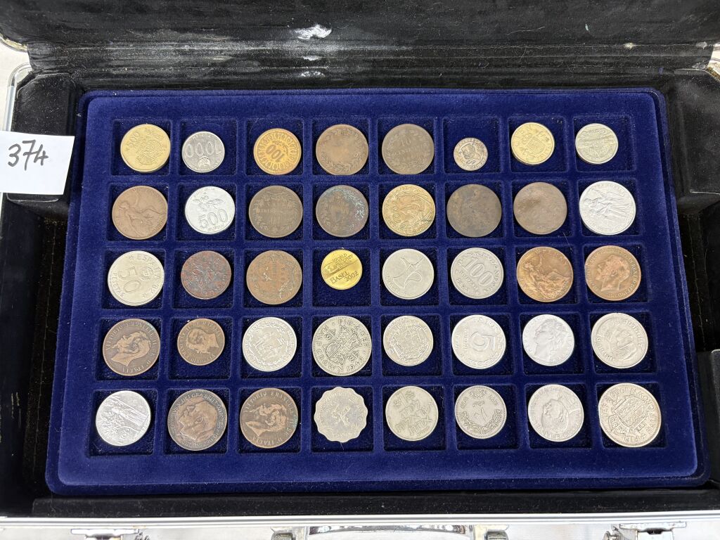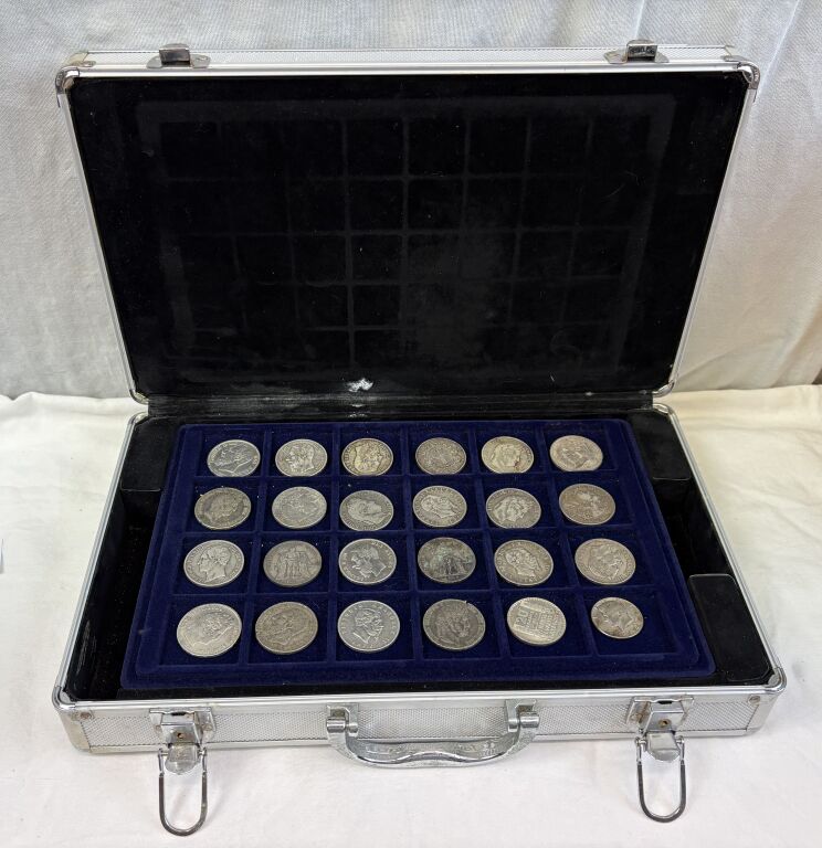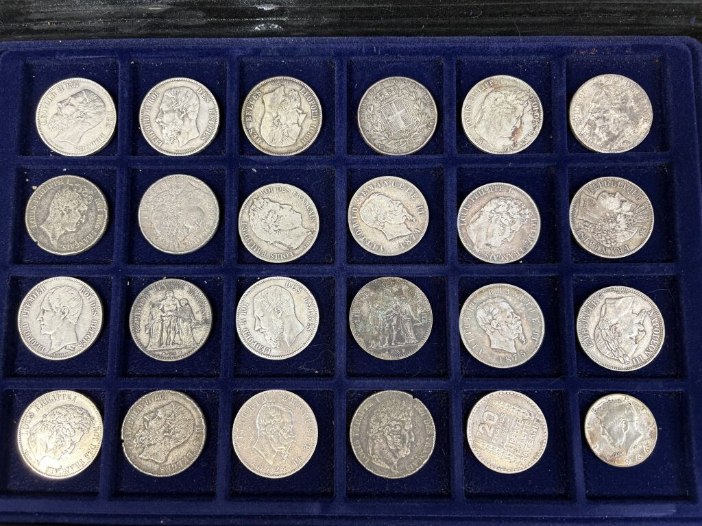 COLLECTION de MONNAIES du MONDE dans UNE GRANDE VALISE (22 x 34 cm) en aluminium avec six plateaux velours bleu (5 à 40 cases + 2 à 24 cases). TOUS METAUX DONT ARGENT - A signaler le 6e plateau qui contient 22 MONNAIES de 5 francs en argent à la taille de l'écu (25 grammes chacune) du 19e siècle + un demi Dollar Kennedy argent + France 20 F Turin 1937 argent.