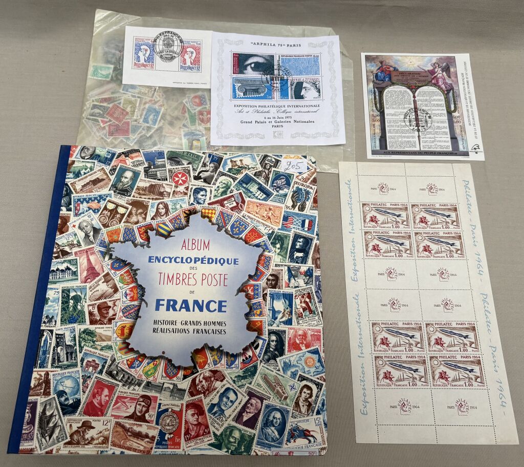 Excellent ensemble pour commencer ou faire commencer la collection des timbres de France. Figure avec l'album une pochette d'environ 800 timbres à placer : les pochettes à fond noir ont étés mises en place par le collectionneur. Également présent un bloc n° 6 PHILATEC 1964, valeur à lui seul 270 euros...., les blocs 7 - 8 - 11...