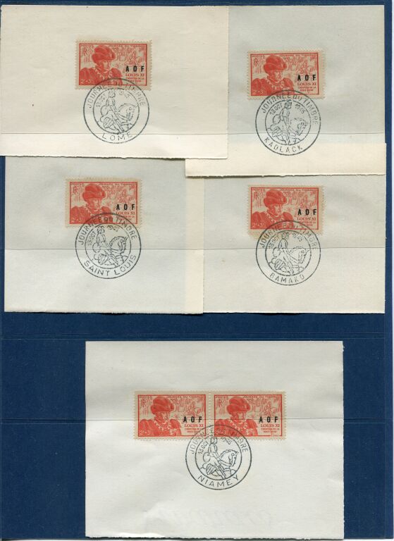 TIMBRE LOUIS XI de France avec surcharge A.O.F. (n° 23) - Collection de 7 documents, chacun revêtu du timbre avec oblitération illustrée d'un messager à cheval, Journée du timbre du 13 octobre 1945 de sept villes formant l'Afrique Occidentale : KAOLACK - DAKAR - NIAMEY - LOME - BAMAKO - SAINT LOUIS - COTONOU.
