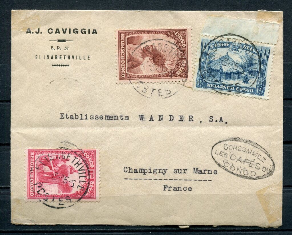 CONGO BELGE - lettre - bel affranchissement à 2 F 50 : 25c Hutte de l' Uele (171) + 1 F éléphant de travail (176) + 1 F 25 chef Manfibetu. Grand cachet à date départ Élisabethville 27 mars 1935 + griffe ovale " CONSOMMEZ LES CAFES DU CONGO ".