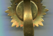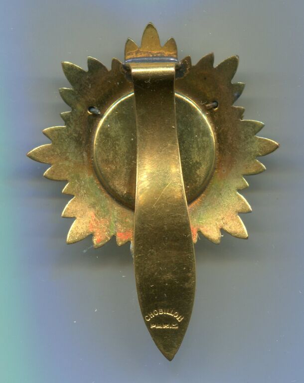 Émail grand feu; En centre cocarde tricolore avec inscriptions et lettres R.F. ajourées rajoutés en relief or ; en pourtour de la cocarde couronne de feuilles de chêne, le tout posé sur un disque d'éclats argent (courts) et or (longs).
