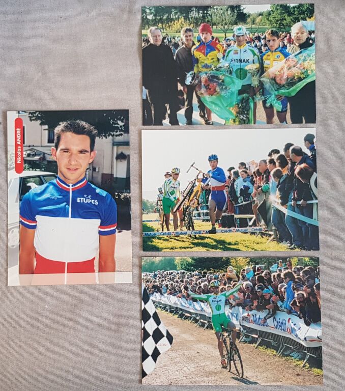 série de 4 cartes postales : Nicolas André champion de France, Francis Mourey en tête, David Derepas vainqueur.