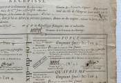 ( * ) 3e grand emprunt révolutionnaire l'emprunt du 19 frimaire an IV (10 décembre 1795) est un emprunt obligatoire, fixé à 60 millions de francs, applicable au quart des contribuables les plus aisés de chaque département. Comporte 10 classes, suivant les revenus, de 50 à 1200 livres. Il est payable en assignats, ce qui permet à l'état de sortir de l'économie ces actifs très dépréciés. Seul le tiers des 3 grands emprunts révolutionnaires est garanti en 1797, ce qui constitue le plus important défaut de paiement national. Le document ci dessus confirme cela par ses seuls 2 coupons honorés & remboursés.