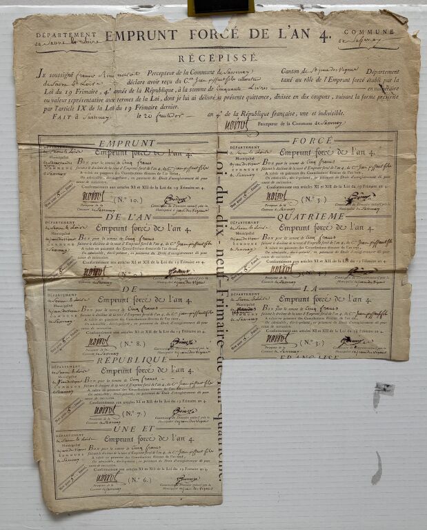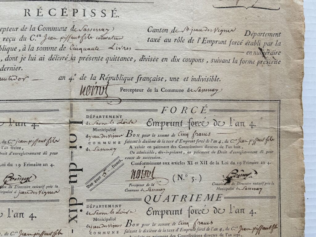 EMPRUNT FORCE de L' AN 4, ( * ) Commune de SASSENAY, département de Saône et Loire, canton de Saint Jean des Vignes. " je soussigné François René Noirot percepteur déclare avoir reçu du citoyen JEAN PIFFAUT Fils cultivateur.. La somme de 50 livres, ...en foi de quoi je lui ait délivré la présente quittance délivrées en dix coupons - 20 fructidor an 4 . - Grand document 49,5 x 38 mm avec 8 coupons monétaires, chacun de 5 francs (manque 1 et 2) "faisant le 10e de la taxe d'Emprunt. A valoir en paiement des contributions de l'An quatre à treize, ou admissible en paiement droits cause de succession ".