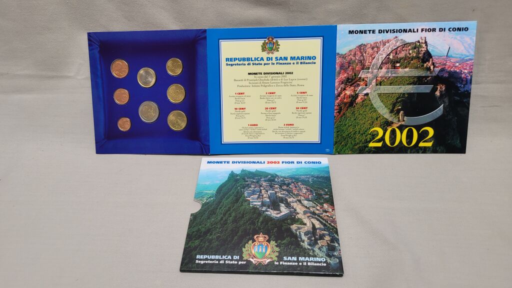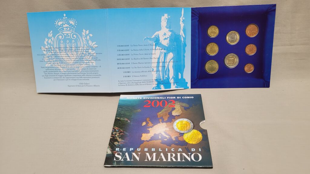 EUROS SAN MARIN - Rare coffret fleur de coin 2002 - Comprend, sous blister, les 8 pièces au millésime de la 1 centime à la 2 euros.