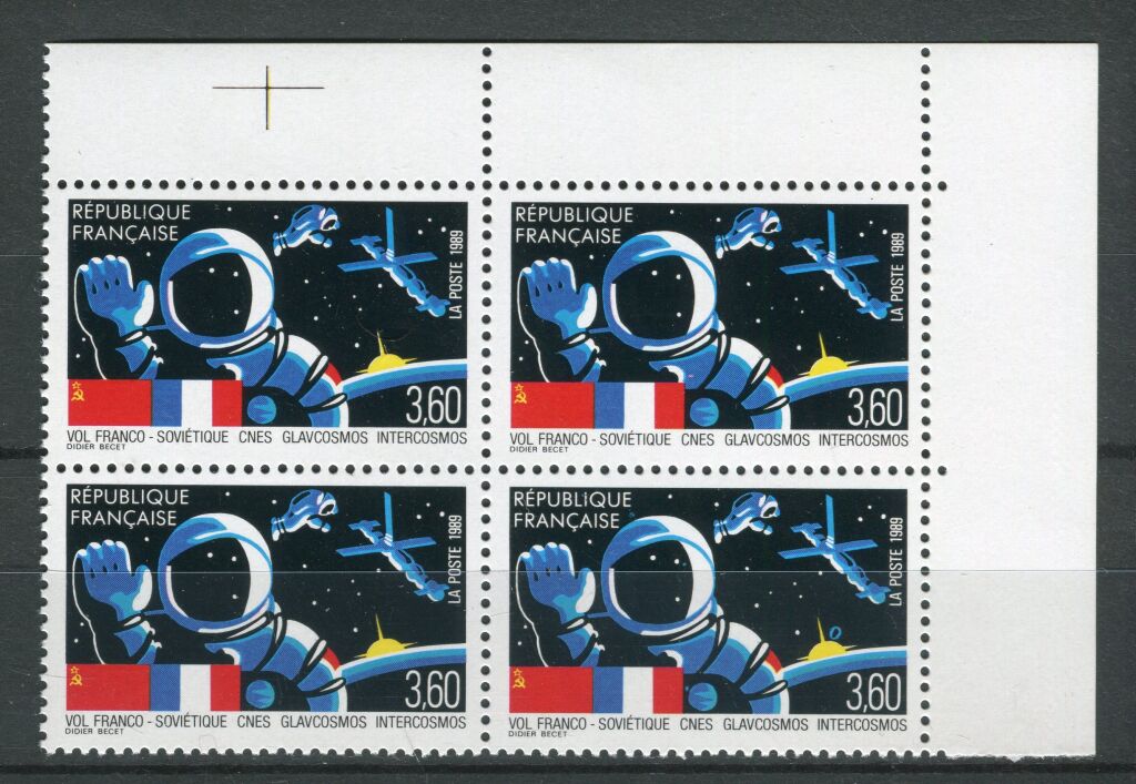 FRANCE 1989 VARIETE - MISSION SPACIALE FRANCO-SOVIETIQUE INTERCOSMOS CNES - GLAVCOSMOS - Timbre de promotion de la mission, BLOC de 4 coin de feuille avec anneau lune ( grosse bulle bleu sur le soleil) - n° 2571 b neuf **