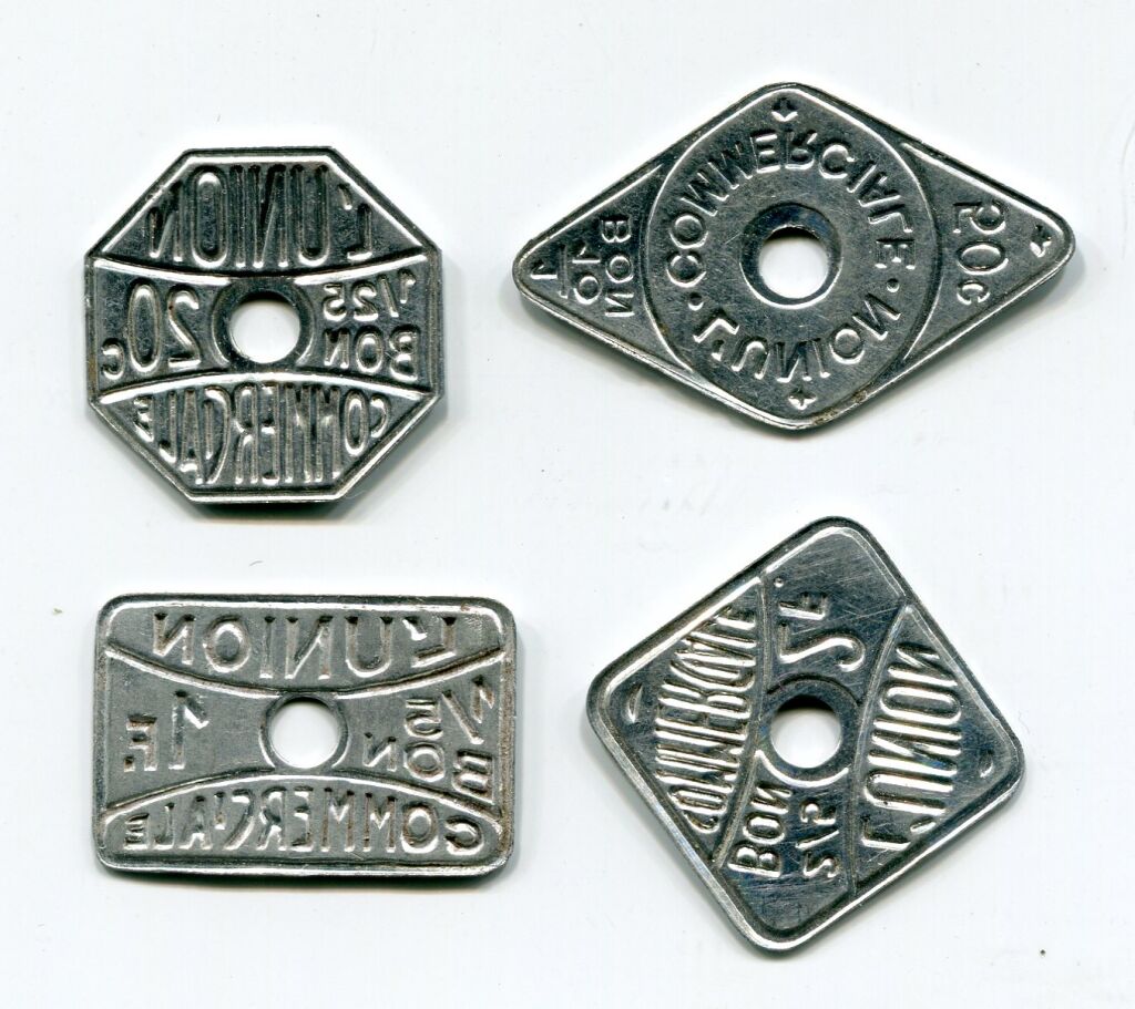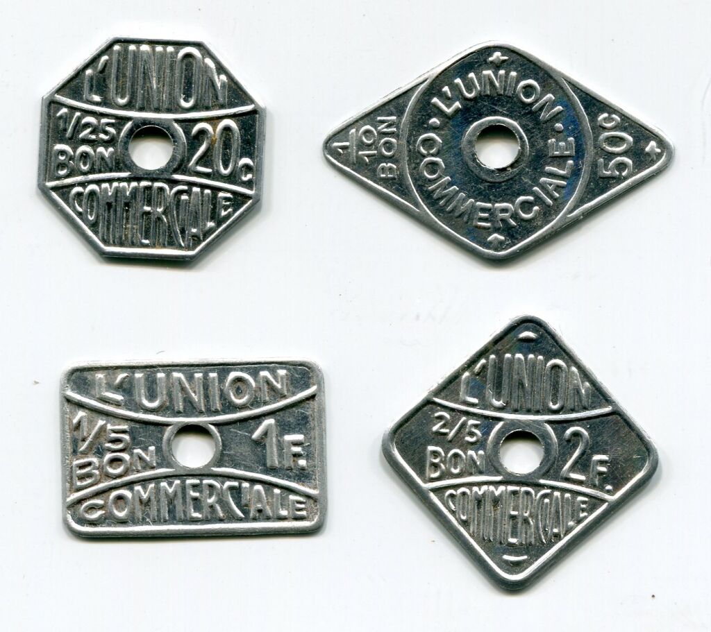 FRANCE 1ère G.M. - VILLENOY LES MEAUX (77) - Quatre monnaies de nécessité de " L'UNION COMMERCIALE " ( ** ) - les 4 en aluminium estampé monofaces avec trou rond en centre : 20c octogonal 18 mm + 50c losangique 17 x 28 mm + 1 F rectangle 14 x 21 mm + 2 F carré 17 mm. - les 4 SUP non circulés (*).