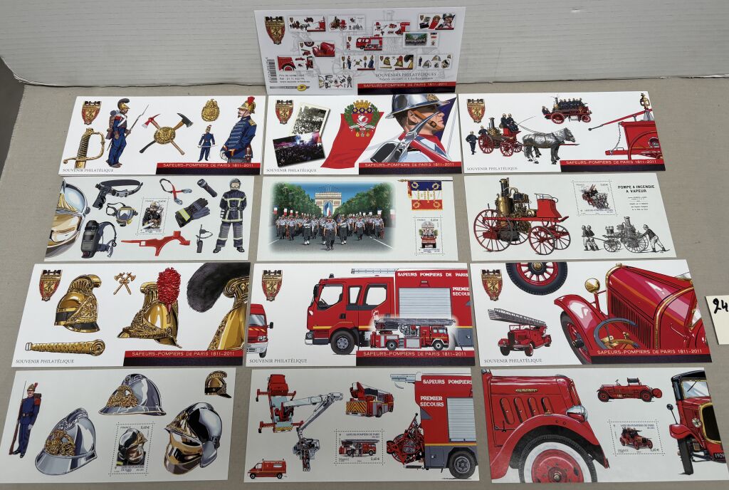 FRANCE 2011 - BLOCS COMMEMORATIFS SOUVENIRS " BICENTENAIRE des SAPEURS POMPIERS de PARIS" . Collection complète de 6 feuillets individuels 205 x 95 mm, gommés, comportant chacun dans l' illustration un timbre dentelé - chaque feuillet dans sa "carte couverture " illustrée individuelle, sur vélin d'Arches. -