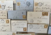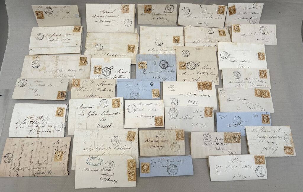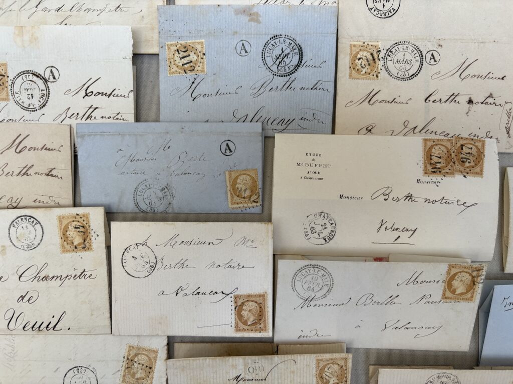 FRANCE 2e Empire - n° 21, 10c bistre Napoléon III tête nue - ARCHIVE de 34 (trente quatre) lettres voyagées essentiellement Indre (36) - cachets divers types, gros chiffres, lettres de boîtes mobiles etc… Archive d'un notaire "pur jus ".