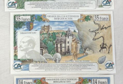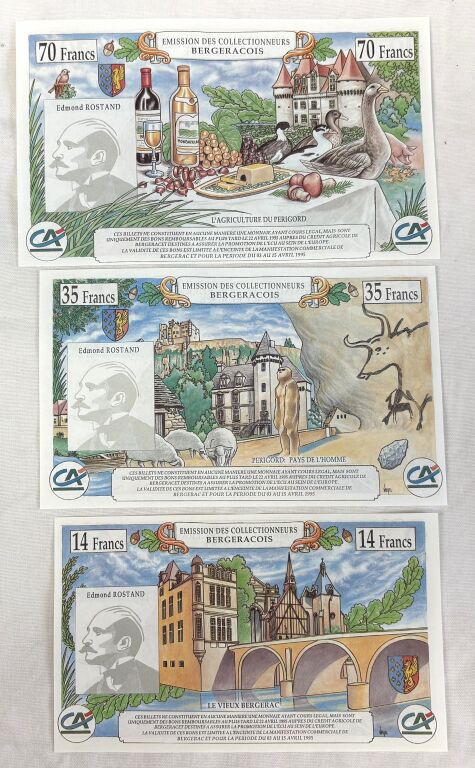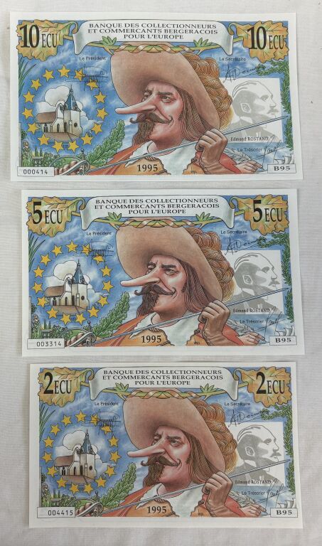 Opération organisée du 3 au 15 avril 1995, période durant laquelle les commerçants de Dordogne acceptaient les coupures en paiement, coupures changeables au C.A. de Bergerac; Trois billets bien illustré par Bernard Beyri et mettant en avant le Périgord, sa gastronomie, son architecture. A l'avers portrait de Cyrano de Bergerac, personnage de théâtre suivant l'œuvre d'Edmond Rostand. - 2, 5 et 10 Ecu - Les 3 NEUFS