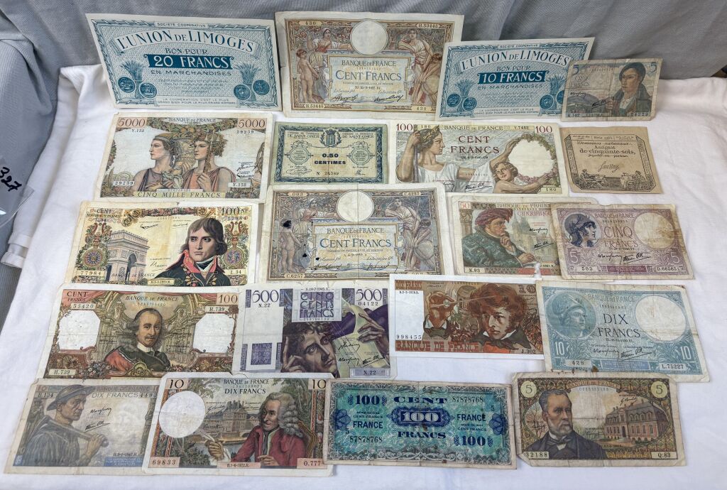 50 F Jacques Cœur, 100 F Corneille, 5 F berger, 100 F Merson 1919, 100 F Merson modifié 1937, 100 NF Bonaparte, 10 F l'Union de Limoges, 20 F idem, nécessité 0,50 c Chambre Commerce St Omer, 100 F Henri IV, 5 F violet, 10 F Minerve, 10 F Berlioz, assignat 50 sols 1793, 500 F Chateaubriand, 5 000 F Terre & Mer, 5 F Pasteur, 100 F Philadelphie 1944, 10 F Voltaire, 10 F mineur.