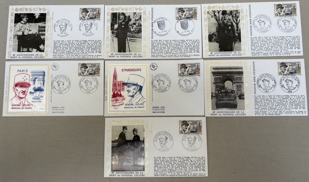 FRANCE - de novembre à décembre 1987, commémorations du 40e anniversaire de la mort du GENERAL LECLERC, Maréchal de France. - Série de 7 enveloppes avec timbre n° 2499 KOUFRA / PARIS / STRASBOURG - Sept oblitérations et 7 illustrations différentes, "collection France Libre", photos d'époque avec De Gaulle, Paris Libéré, Prise d'armes, Amiens / Paris / Strasbourg / Alençon.