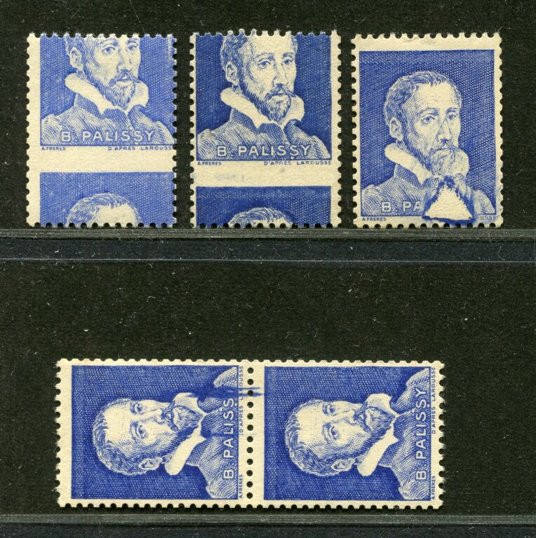 FRANCE EXPERIMENTATION - BERNARD PALISSY - QUATRE SPECTACULAIRES VARIETES : Yvert n° Pa 10 bleu pâle PIQUAGE à CHEVAL + Pa 8 outremer PIQUAGE à CHEVAL + Pa 8 VARIETE DITE au sapin (grosse tâche blanche triangulaire en bas) + paire verticale provenant de roulette n° Pa 8 traits parasites sur le timbre haut sur le plastron de Palissy - Timbres neufs **