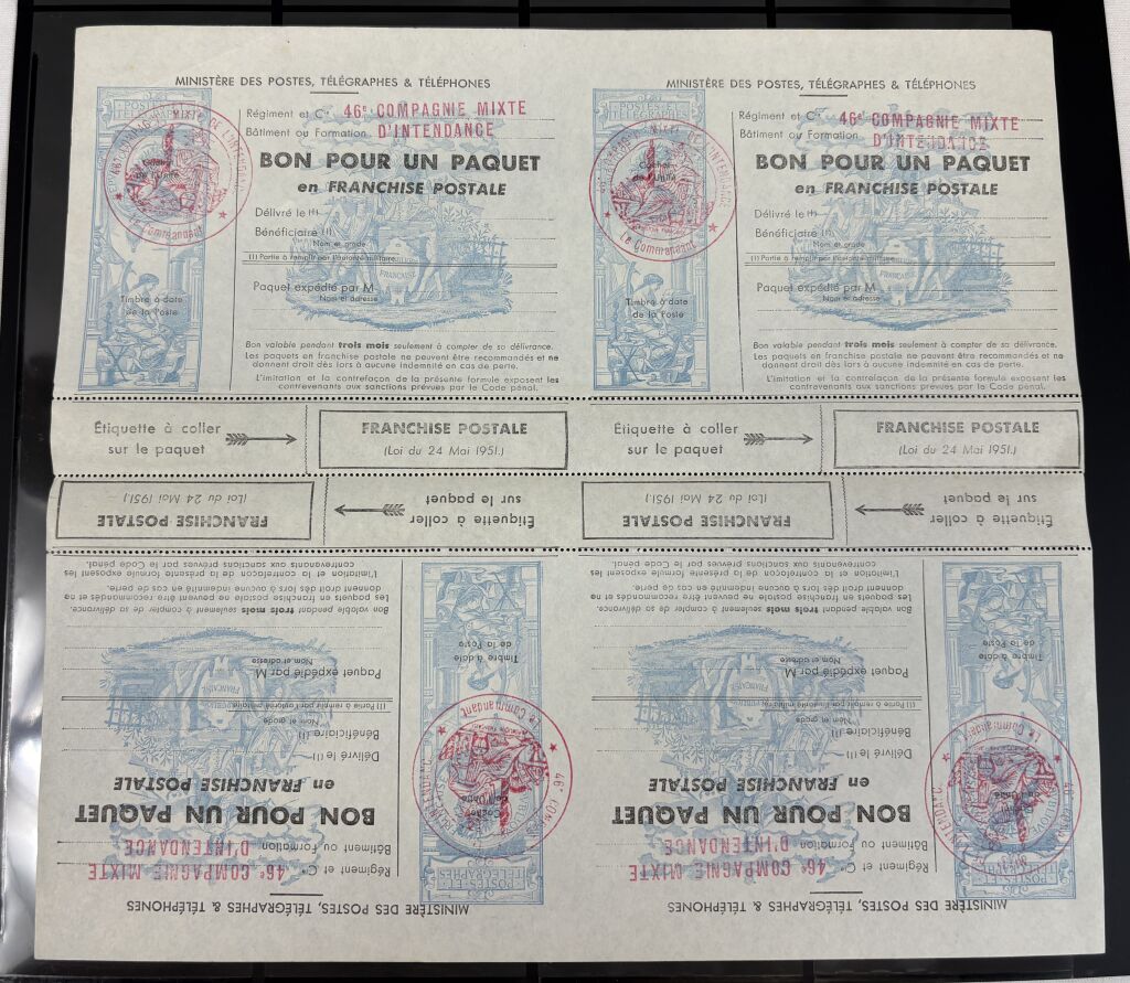 FRANCE - FRANCHISE MILITAIRE pour COLIS 1952 " Ministère des Postes, Télégraphes & Téléphones " - Yvert n° 14, bleu et noir, 1er type avec 5 lignes de texte de validité. - RARE BLOC de QUATRE BONS 2 + 2 impression tête bêche.
