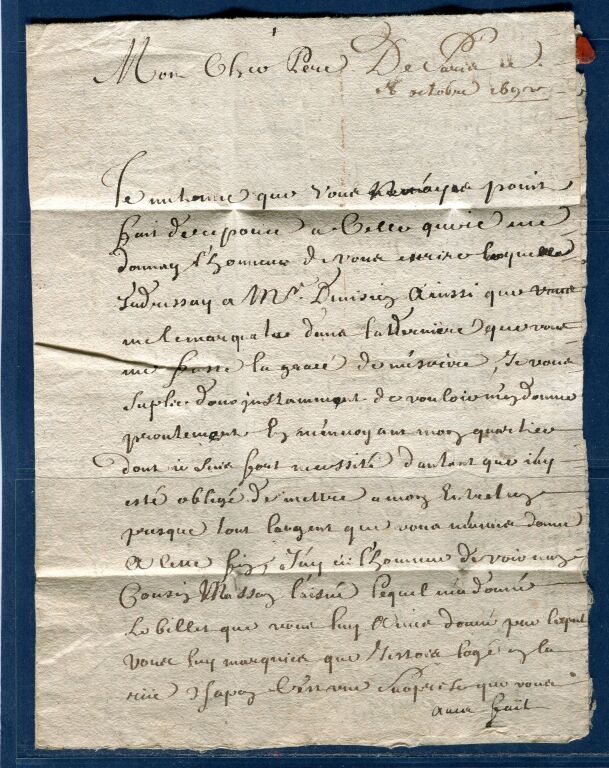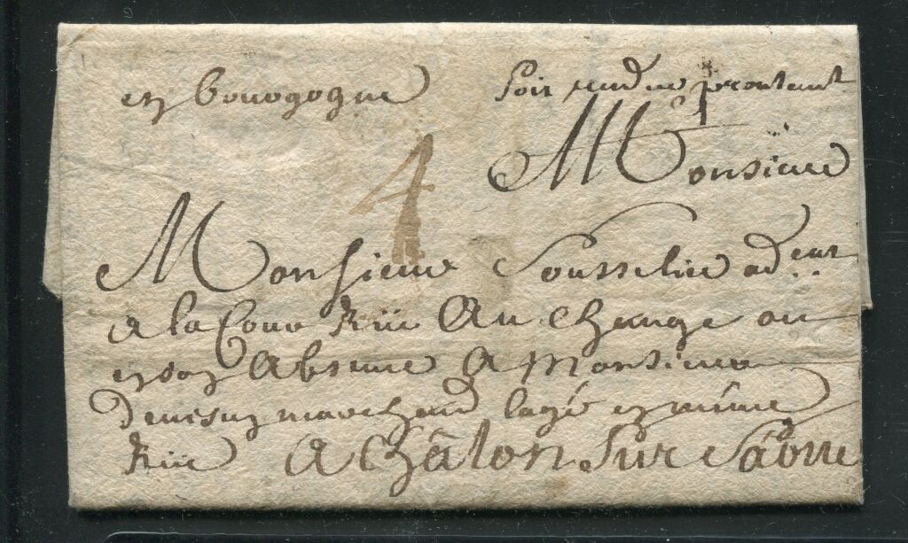 FRANCE - HISTOIRE POSTALE PRECURSEURE du 17e siècle - RARE PLI au départ de PARIS, daté du 18 octobre 1692, pour CHALON sur SAONE "en Bourgogne " - " soit rendue promptement " à Monsieur Sousselier administrateur à la Cour rue au change ou en cas d'absence à Mr Denisuy marchand logé es même rüe ".
