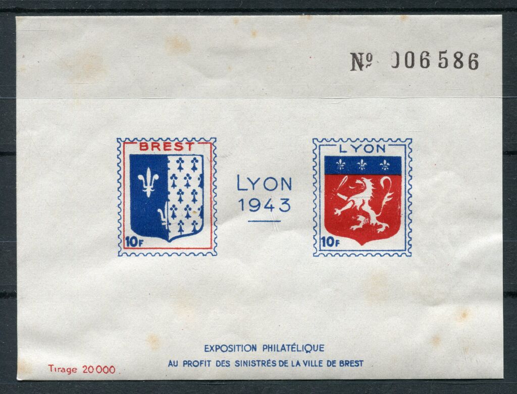 FRANCE - LYON 1943 - feuillet numéroté à 20 francs de l' Exposition Philatélique organisée au profit des SINISTRES de la VILLE de BREST - 75 x 98 MM.