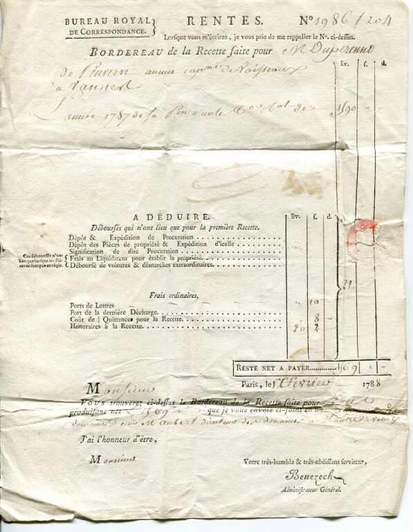 Relevé justificatif de rentes, du 1er février 1788, net pour l'année 1787 diminué des frais et émoluments de 4 deniers par livre, à Monsieur DUDERENNE de NEVERN de VANNES, correspondance redirigée sur " au Gueméné par Pontivy " ancien capitaine de vaisseau.