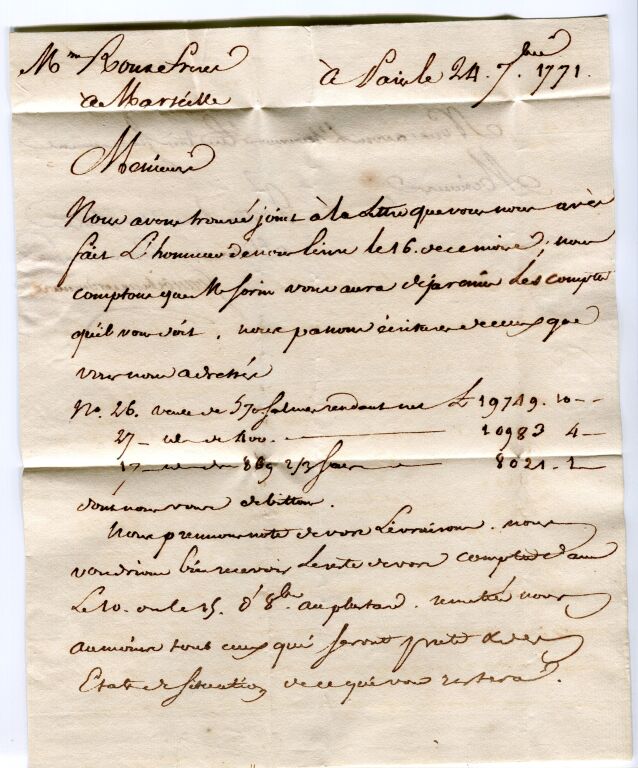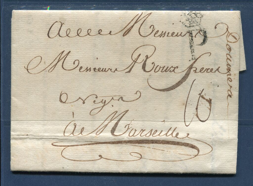 FRANCE - MARCOPHILIE du 18e SIECLE - Pli en PORT DU au départ de Paris du 24 septembre 1771 MARQUE POSTALE de DEPART grand P couronné, frappe en noir, 25 x 12 mm - Lettre d'affaires pour Messieurs Roux frères, négociants à Marseille.