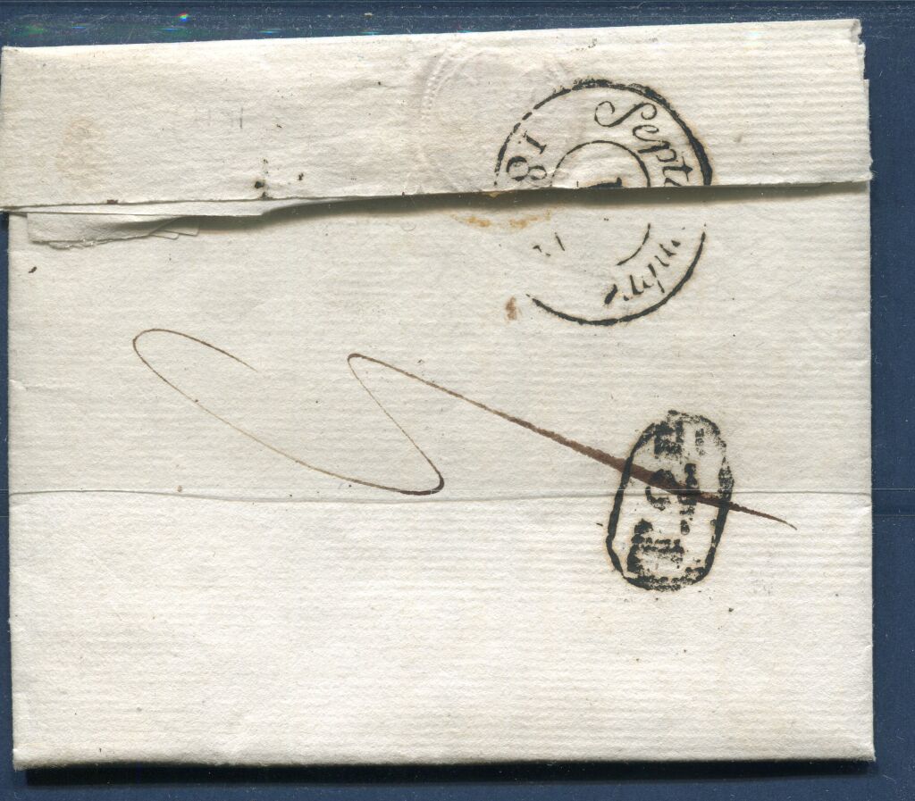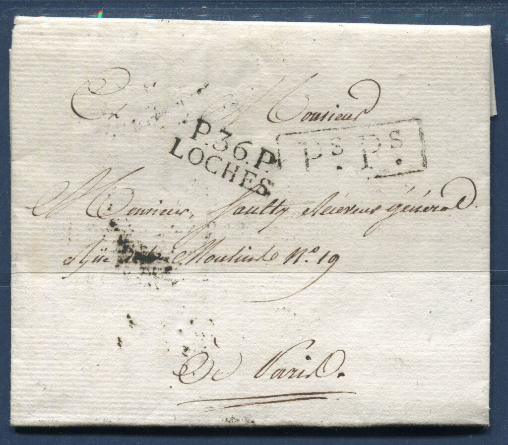 Beau pli en PORT PAYE pour Paris - Marque postale linéaire 2 lignes, 9 x 23 mm, frappe en noir, " P.36.P. / LOCHES " + présence de la griffe encadrée " Ps Ps " ( " port payé pour Paris " ) - au dos : Bloc dateur arrivée a l'Hôtel des Postes de Paris " 1 septembre 1817 " (Rochette-Pothion n° 1209 + griffe encadrée " T 2 E " (marque d'arrivée pour les lettres provenant des départements 2e levée), Rochette-Pothion n° 1146.