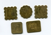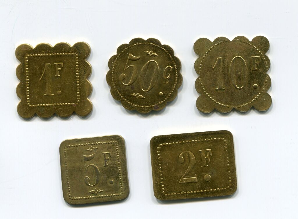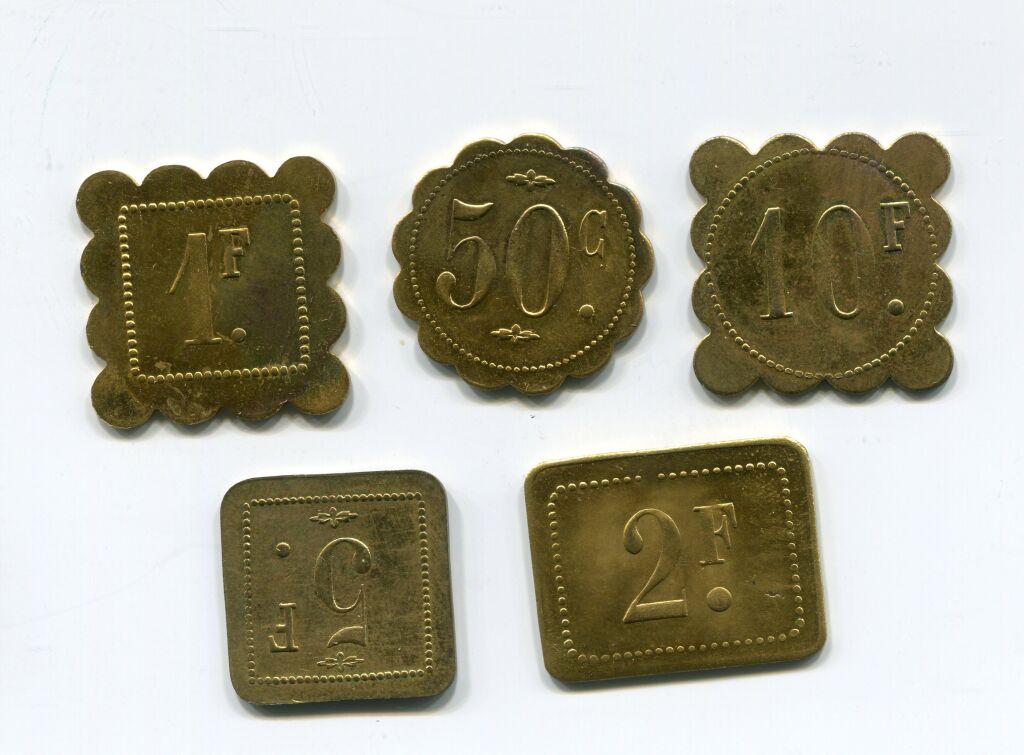 FRANCE - MONNAIES DE NECESSITE - collection de 5 monnaies en laiton circa 1920.