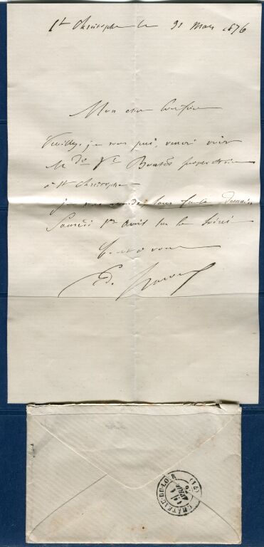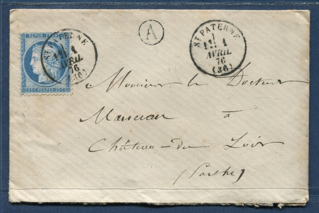 Le timbre, n° 60 25c Cérès bleu, est oblitéré du cachet à date et non du losange gros chiffres ; en fait il s'agit pour St Paterne du premier jour d'oblitération sur le timbre au lieu de l'utilisation des G.C. La lettre porte également le cachet dans un cercle " A " de boite rurale ; le " A " correspondant à St Christophe sur le Nais - à l'intérieur lettre - au dos arrivée Ch du Loir, cachet au type 17 du 1er avril. Cachets parfaitement marqués.